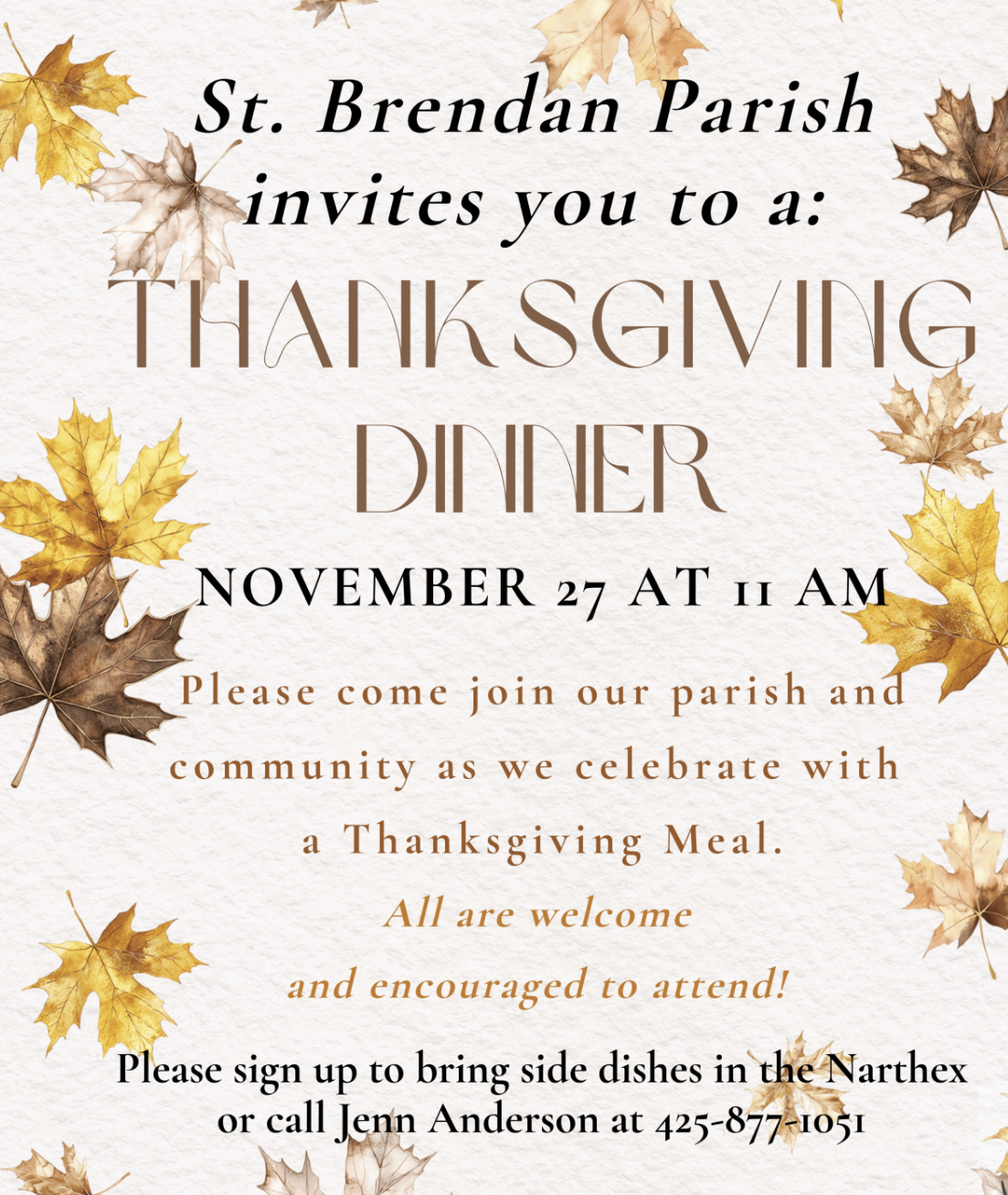 • ST. BRENDAN GARDENS – Saturday AM, NOV. 22 • Last work party of the year. Please bring gloves and whatever tools you might need. Lunch will be provided. Any questions? Contact Anneliese (425-770-2103).