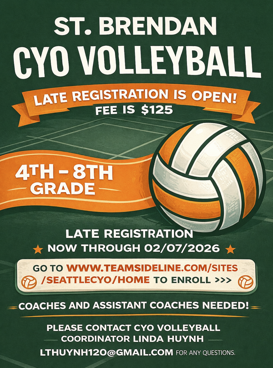 Hey, Parents – did you know that your children are eligible and welcome to participate in all St. Brendan CYO sports programs simply by being registered parishioners at either St. Brendan or St. Teresa of Calcutta Parish Family? Financial Assistance is available to help with registration fees, please contact CYOad@saintbrendan.org for details. For more information on CYO and the programs offered at St. Brendan, please reach out to Ena Demeter at cyosecretary@saintbrendan.org. |